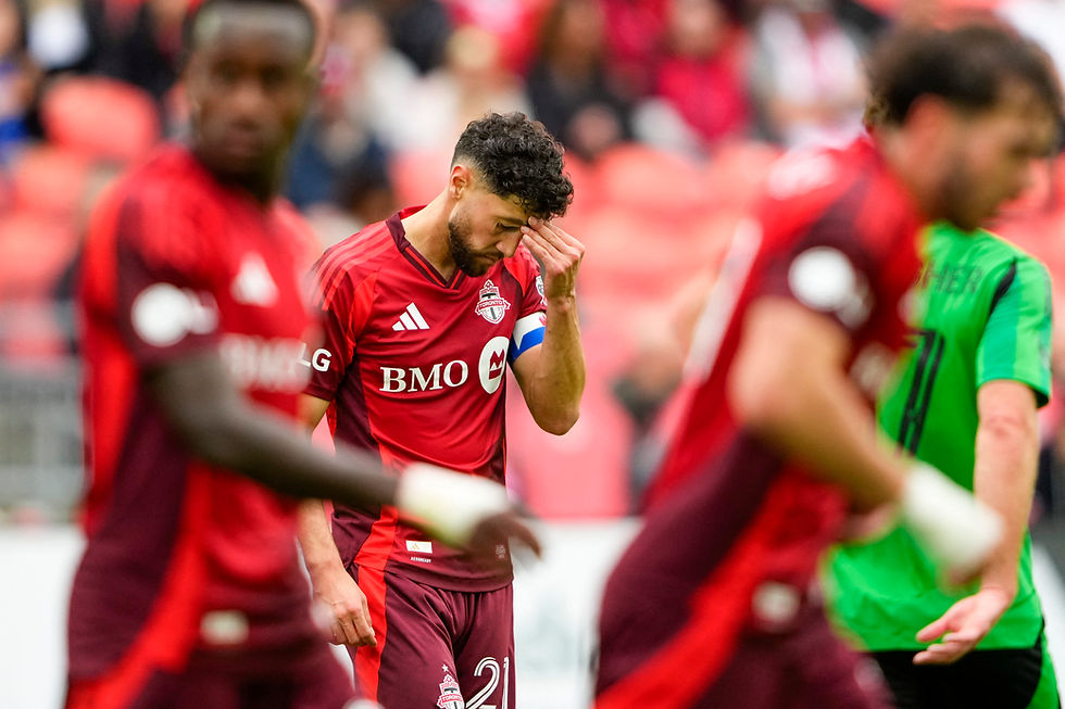 Toronto FC midfielder Jonathan Osorio (21) holds his head during an MLS game against Austin FC at BMO Field in Toronto, Ontario on April 18, 2026.